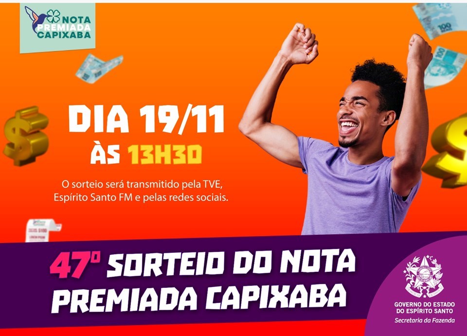 Chegou a hora de conhecer os premiados do mês de novembro do Nota Premiada Capixaba. O 47º sorteio do maior programa de educação fiscal do Espírito Santo acontece nesta quarta-feira (19), às 13h30, com transmissão ao vivo pela TVE Espírito Santo, pela Espírito Santo FM e pelas redes sociais da emissora.