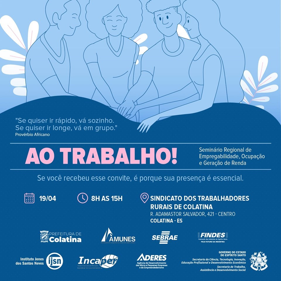 O município de Colatina receberá, nesta terça-feira (19), o terceiro ciclo da conferência “Ao trabalho: Seminário Regional de Empregabilidade, Ocupação e Geração de Renda”. A iniciativa é uma promoção da Secretaria de Trabalho, Assistência e Desenvolvimento Social (Setades), por meio da Subsecretaria de Trabalho, Emprego e Geração de Renda (Subtrab).