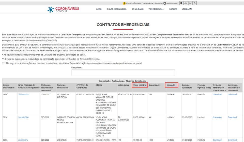 A consulta aos dados sobre compras e contratos emergenciais realizados para o combate ao novo Coronavírus (Covid-19) no Estado ganhou novas funcionalidades nesta terça-feira (19). Agora, a informação conta com uma coluna em que é discriminado o valor unitário de cada item adquirido, com as seguintes unidades de medida: litro, metro e quilo, entre outros.