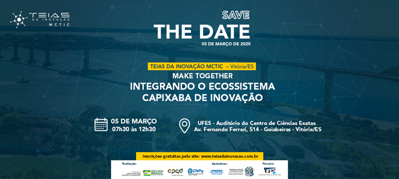 Vitória recebe, no próximo dia 05 de março, o “Make Together: Integrando o Ecossistema Capixaba de Inovação”, do projeto “Teias da Inovação MCTIC”. O evento é gratuito e será realizado no campus de Goiabeiras, Vitória, da Universidade Federal do Espírito Santo (Ufes), com debates focados em ciência, inovação e tecnologia. As inscrições já estão abertas e podem ser feitas pelo site www.teiasdainovacao.com.br.
