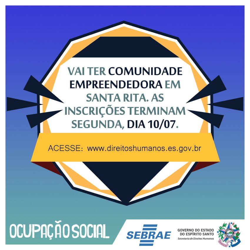 Hoje é o último dia para se inscrever no curso do Comunidade Empreendedora para o bairro Santa Rita, em Vila Velha. O curso é ofertado pelo Sebrae-ES para bairros do Programa Ocupação Social. São 30 vagas disponíveis para a comunidade. As inscrições podem ser feitas pelo site www.direitoshumanos.es.gov.br.