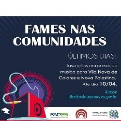As inscrições para o Projeto Fames nas Comunidades nos bairros de Nova Palestina, em Vitória, e de Vila Nova de Colares, na Serra, estão abertas até esta segunda-feira (10). São 360 vagas, 180 para cada bairro, visando atender crianças e jovens do Programa Ocupação Social. As oficinas oferecidas são as de percussão, de voz e de violão. Para se inscrever acesse www.direitoshumanos.es.gov.br ou www.fames.es.gov.br.