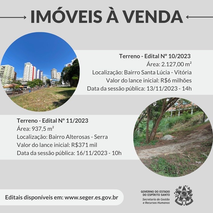 Já no próximo dia 16 de novembro, às 10 horas, será realizada a sessão pública do Edital Nº 11/2023, que oferta um terreno de 937,5 metros quadrados, localizado no bairro Alterosas, no município da Serra, com lance inicial de R$ 371 mil.