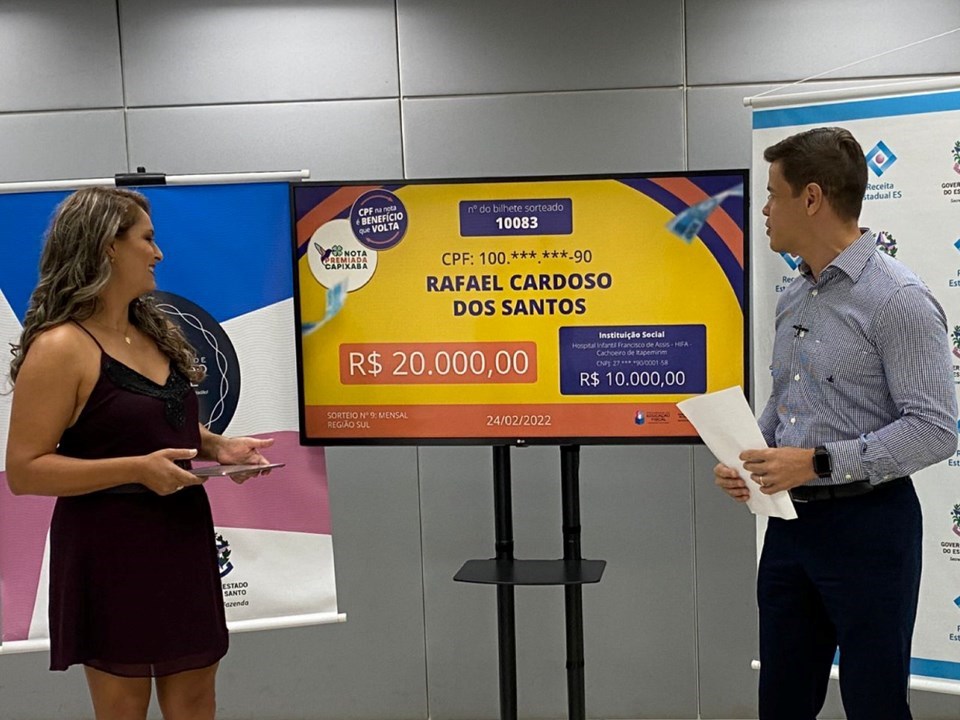 Foi realizado, nesta quinta-feira (24), o segundo sorteio do programa Nota Premiada Capixaba. O sorteio aconteceu na sede da Secretaria da Fazenda (Sefaz), no edifício Aureliano Hoffmann, em Vitória, e teve transmissão ao vivo pela TV Educativa do Espírito Santo (TVE-ES). A apresentação ficou por conta da jornalista Verônica Salazar e do auditor fiscal e gerente de Arrecadação e Cadastro da Sefaz, Thiago Venâncio (clique AQUI para assistir).