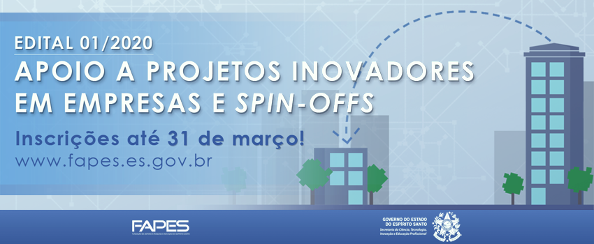 - Projetos Empresariais Inovadores Desenvolvidos em Spin-Offs: voltada a projetos empresariais inovadores em empresas derivadas, as spin-offs empresariais, para as quais serão destinados até R$ 3 milhões. A proposta poderá ser contemplada com até R$ 150 mil e o proponente deverá aportar uma contrapartida de 10% a 30%. É necessário que a spin-off apresente uma carta de aceitação de uma incubadora sediada no Espírito Santo.