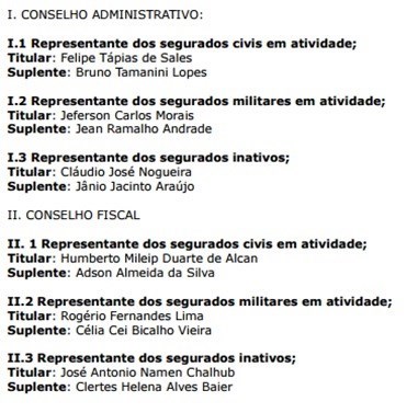 A votação foi facultativa e foram eleitos membros titulares e suplentes para cada um dos Conselhos – administrativo e fiscal, por categoria (ativo civil, ativo militar e aposentado), com mandato de três anos. Vale lembrar também que o quadro de pessoal do Colegiado também possui representantes dos poderes Executivo, Legislativo e Judiciário, que atuarão por dois anos nos Conselhos.