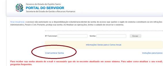 Já os ativos, caso o servidor tenha e-mail cadastrado no SIARHES, ele deve também entrar no Portal do Servidor, na página sistemas.es.gov.br/seger/eservidor/Login, preencher o campo referente ao número funcional, clicar em Criar/Lembrar Senha” e, por fim, informar o CPF. A senha será encaminhada para o e-mail do servidor. Se ele não tiver e-mail cadastrado, deve solicitar a senha junto à Central de Atendimento ao Servidor (CAS), localizada provisoriamente no anexo do auditório do Edifício Fábio Ruschi, Avenida Governador Bley, nº 236, Centro, Vitória.
