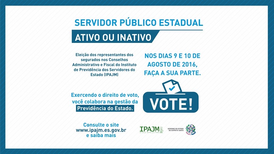 Os segurados, ativos e aposentados do Instituto de Previdência do Estado (IPAJM), que fazem parte do Poder Executivo e estão interessados em participar da eleição dos Conselhos Administrativo e Fiscal da autarquia, devem ficar atentos, pois o pleito ocorrerá nos próximos dias 9 e 10, por meio da internet. Para votar, o eleitor deverá utilizar número funcional e senha, que é a mesma aplicada para acessar contracheque, margem consignável para empréstimo e informe de rendimento para Imposto de Renda no Portal do Servidor (www.servidor.es.gov.br)