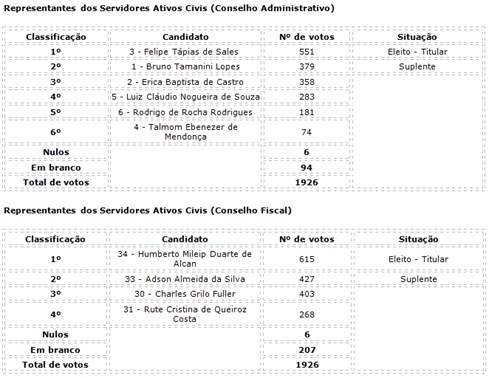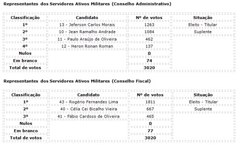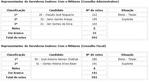 Destaca-se que foram eleitos membros titulares e suplentes para cada um dos Conselhos, por categoria (ativo civil, ativo militar e aposentado), conforme tabelas abaixo, que terão mandato de três anos.