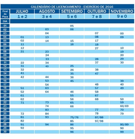 O calendário de pagamento é definido de acordo com os números finais da placa. A cobrança do Licenciamento Anual começou em julho com os veículos com as placas terminando em 1 e 2. O encerramento da arrecadação será em novembro com as placas de término 9 e 0.