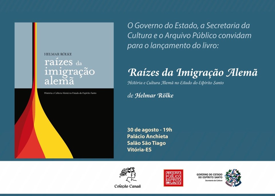 O livro "Raízes da Imigração Alemã: história e cultura alemã no Estado do Espírito Santo", de Helmar Rölke, será lançado pelo Arquivo Público do Estado (APEES), nesta terça-feira (30), no Palácio Anchieta, às 19h, fechando a programação “Agosto da Cultura”, da Secult. A publicação faz parte da linha editorial Coleção Canaã do APEES, volume 23. A obra traz o resgate da memória da imigração alemã em terras capixabas e referências para o entendimento da cultura dos germânicos que colonizaram o Estado, especialmente os pomeranos, que formam o maior grupo entre os imigrantes das diversas províncias do antigo Império Alemão que entraram no Espírito Santo.