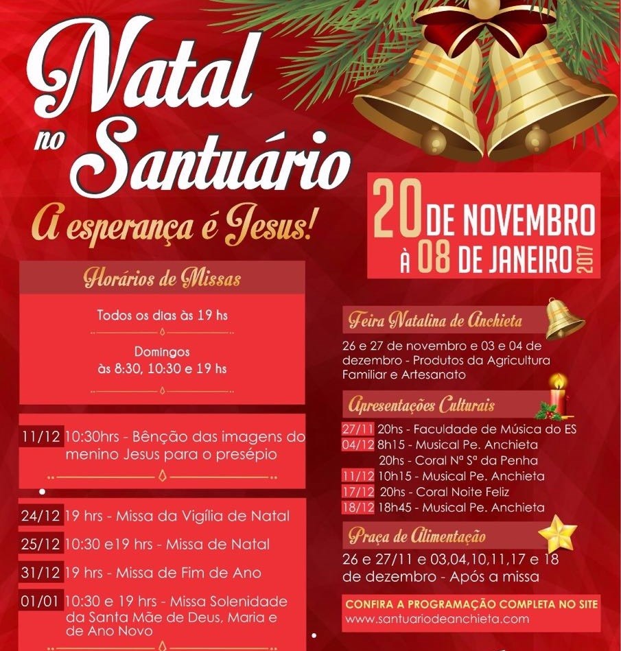 Em parceria com a vice-governadoria do Estado, Secretaria de Estado da Cultura (Secult), Faculdade de Música do Espírito Santo (Fames), Serviço Brasileiro de Apoio às Micro e Pequenas Empresas (Sebrae) e o Santuário Nacional de São José de Anchieta acontece, neste sábado (26), a partir das 19 horas, a  Abertura da Feira Natalina de Anchieta e apresentações musicais.