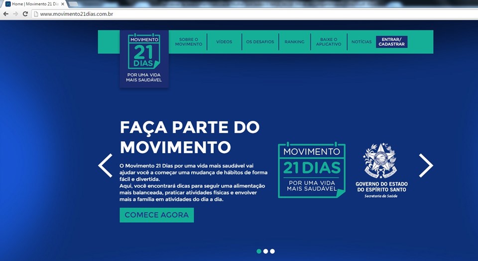 O site do Movimento 21 Dias (www.movimento21dias.com.br) está com novidades. Agora, ao acessar a página, o usuário pode acompanhar o número de cadastrados, desafios assumidos e medalhas alcançadas. Além de rankings que mostram a lista de desafio mais assumido, cidade com maior número de participantes e desafio mais concluído.