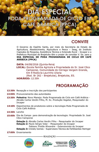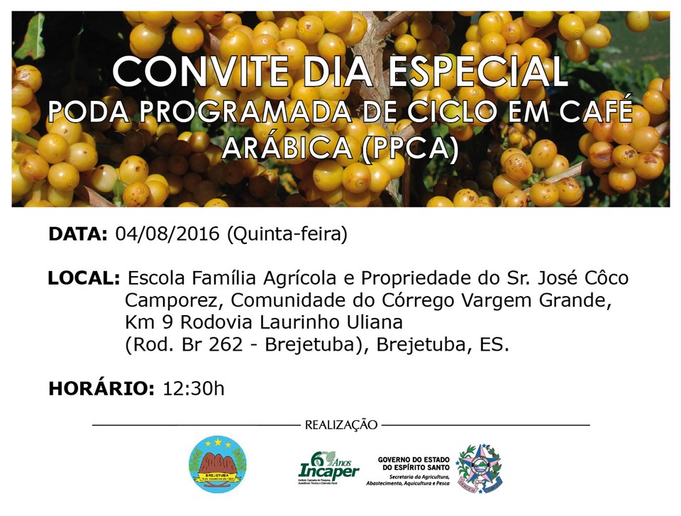 Para alcançar a sustentabilidade e a competitividade da produção cafeeira é necessário investir em tecnologias inovadoras capazes de aumentar a eficiência das lavouras, reduzir custos, alavancar os processos de certificação e produzir café de qualidade. Diante deste contexto, o Instituto Capixaba de Pesquisa, Assistência Técnica e Extensão Rural (Incaper) apresenta em Brejetuba, nesta quinta-feira (04), uma nova tecnologia: a Poda Programada de Ciclo em Café Arábica (PPCA).