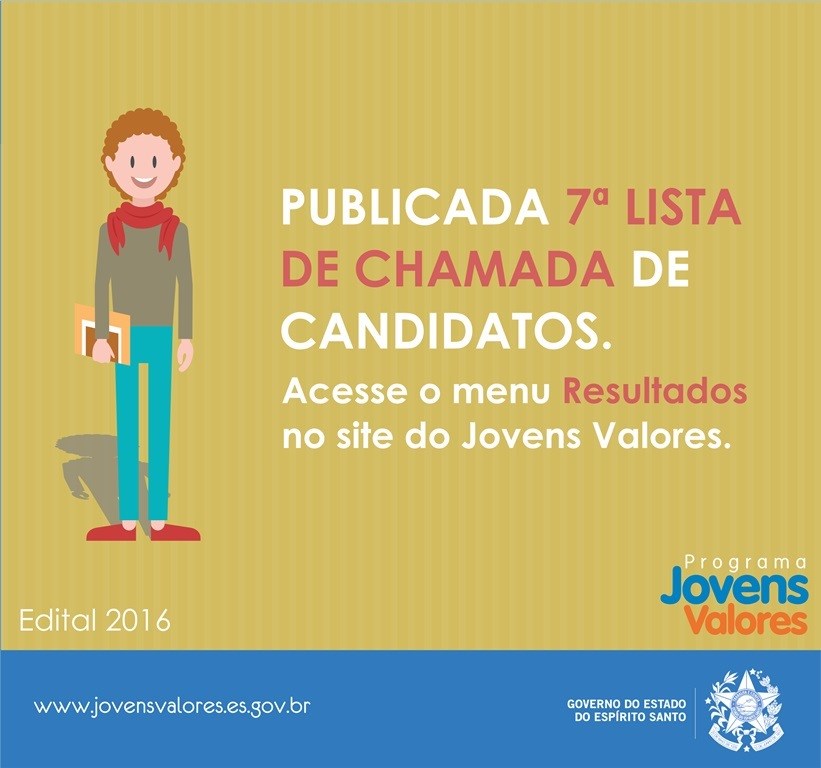O Jovens Valores, programa de estágio do Governo do Estado, divulgou, nesta sexta-feira (11), a 7ª chamada de candidatos pré-selecionados para as vagas de estágio. O documento pode ser conferido no site www.jovensvalores.es.gov.br, no menu Resultados.