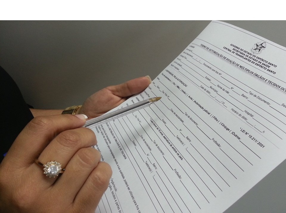Segundo a coordenadora da Central de Transplantes do Espírito Santo, Rosemery Erlacher, no caso de adultos, a autorização pode ser concedida pelo cônjuge ou por um parente de primeiro ou segundo grau maior de idade, seja na linha reta ou colateral. Assim, pai, mãe, filhos, irmãos, avós, netos, marido e esposa, inclusive parceiros em relação homoafetiva que vivem em união estável (relação comprovada por meio de documentos aceitos em cartório), são as pessoas legalmente amparadas para tomar a decisão de doar ou não os órgãos de seu ente querido.